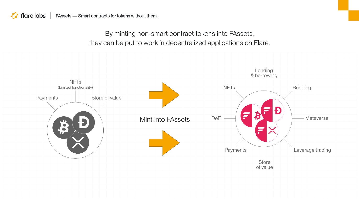 The FAssets system allows non-smart contract tokens such as BTC, XRP & DOGE to be used trustlessly with smart contracts on Flare. By minting these non-smart contract tokens into FAssets it will be possible to put them to work earning yield or rewards in decentralized applications on the Flare network.