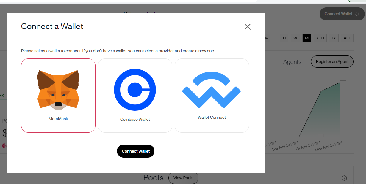 - Choosing an Agent: On the dashboard, you’ll see a list of available agents as well as their vault addresses and associated fees.