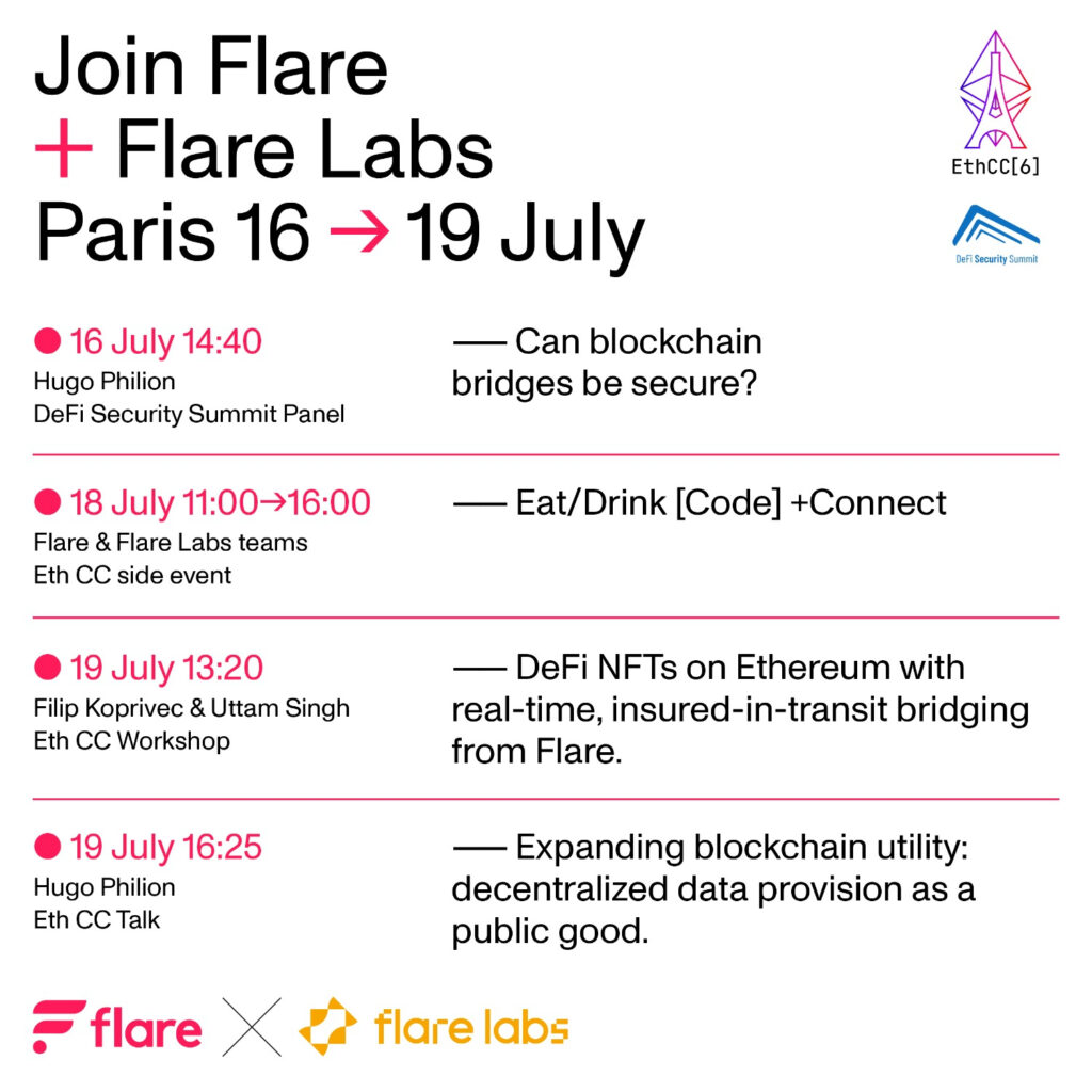 The Flare and Flare Labs teams are participating in or hosting four blockchain events across Paris between the 16th and 19th of July. We will be exploring how decentralized data access at scale and negligible cost can expand the utility of blockchain and help support the machine learning economy.