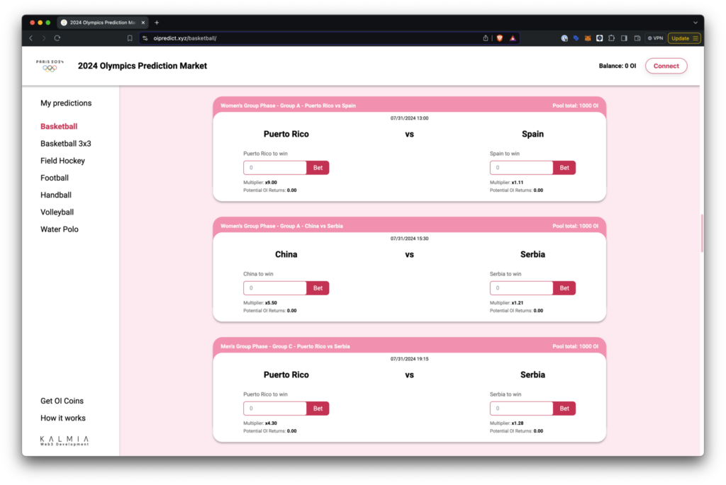 There are prediction markets for basketball, football, field hockey, handball, volleyball and water polo. Make your predictions using the OI tokens you can mint each day for free. Once the match is complete, the dapp will use the Data Connector to provide decentralized proof of the final result. Attestation providers will query multiple different sport results providers and arrive at consensus on the result of the match. The prediction market smart contract can then trustlessly verify the winner of the match and allow the distribution of winning tokens.