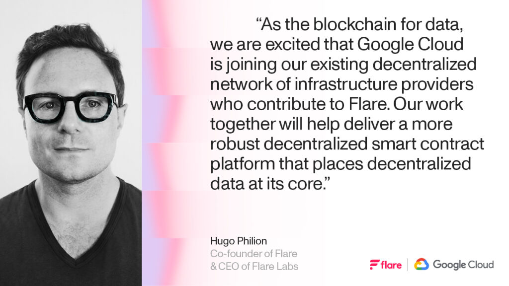 On 15 January 2024, we announced that Google Cloud has been onboarded as an infrastructure provider on Flare. This novel role doesn’t exist on other blockchain platforms, and is required for Flare to fulfill its mission as the Blockchain For Data.